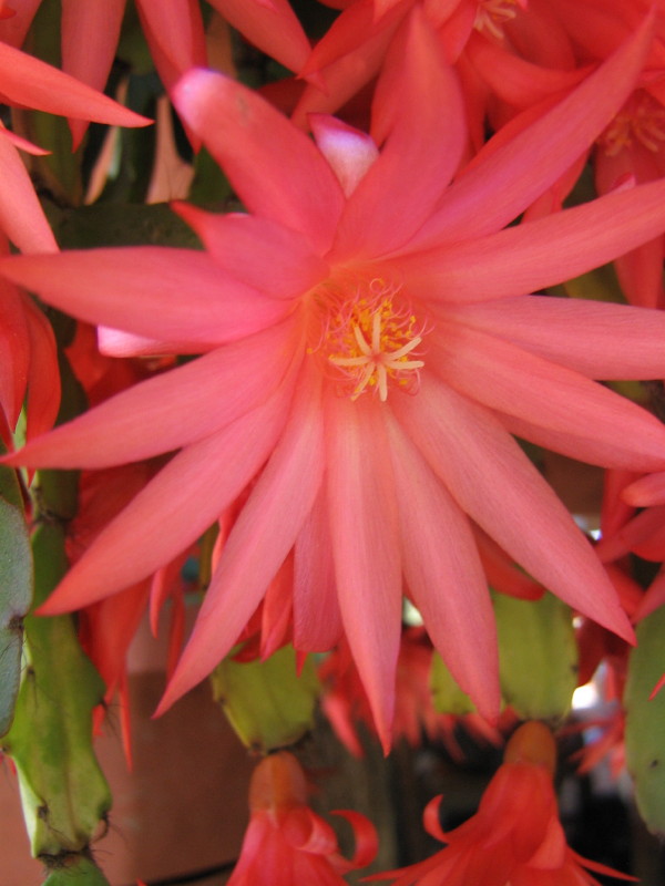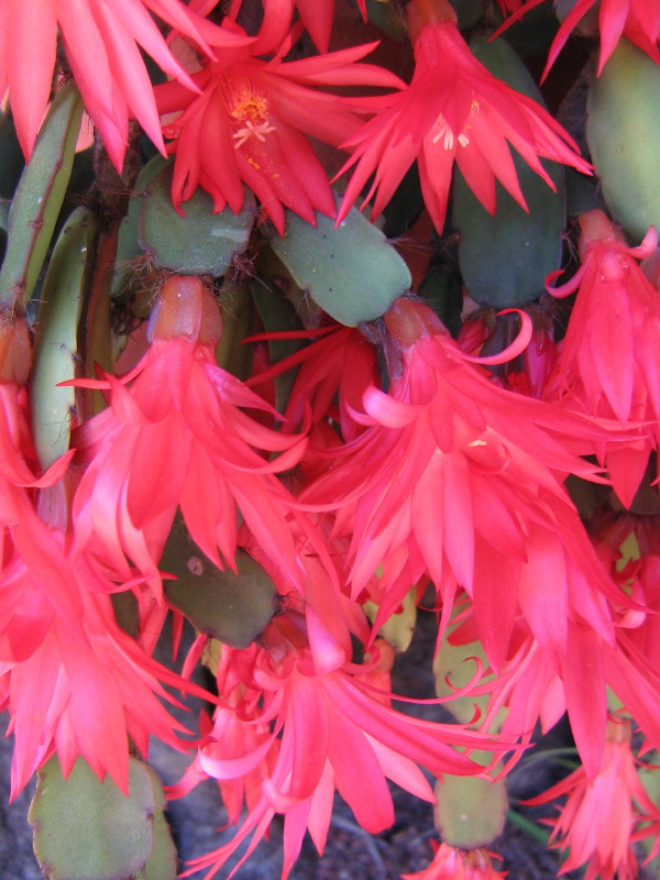This week’s photos are what in England we used to call an Easter cactus, because it flowered about Easter. Here in Australia it flowers in spring, but that’s nowhere near Easter. I’ve Googled it, and I think it is properly called Hatiora gaertneri, the name being nowhere near as pretty as the flower, as usual. It is really spectacular this year, although I should have moved it into the sunshine before taking the pictures, it would have looked even better.
